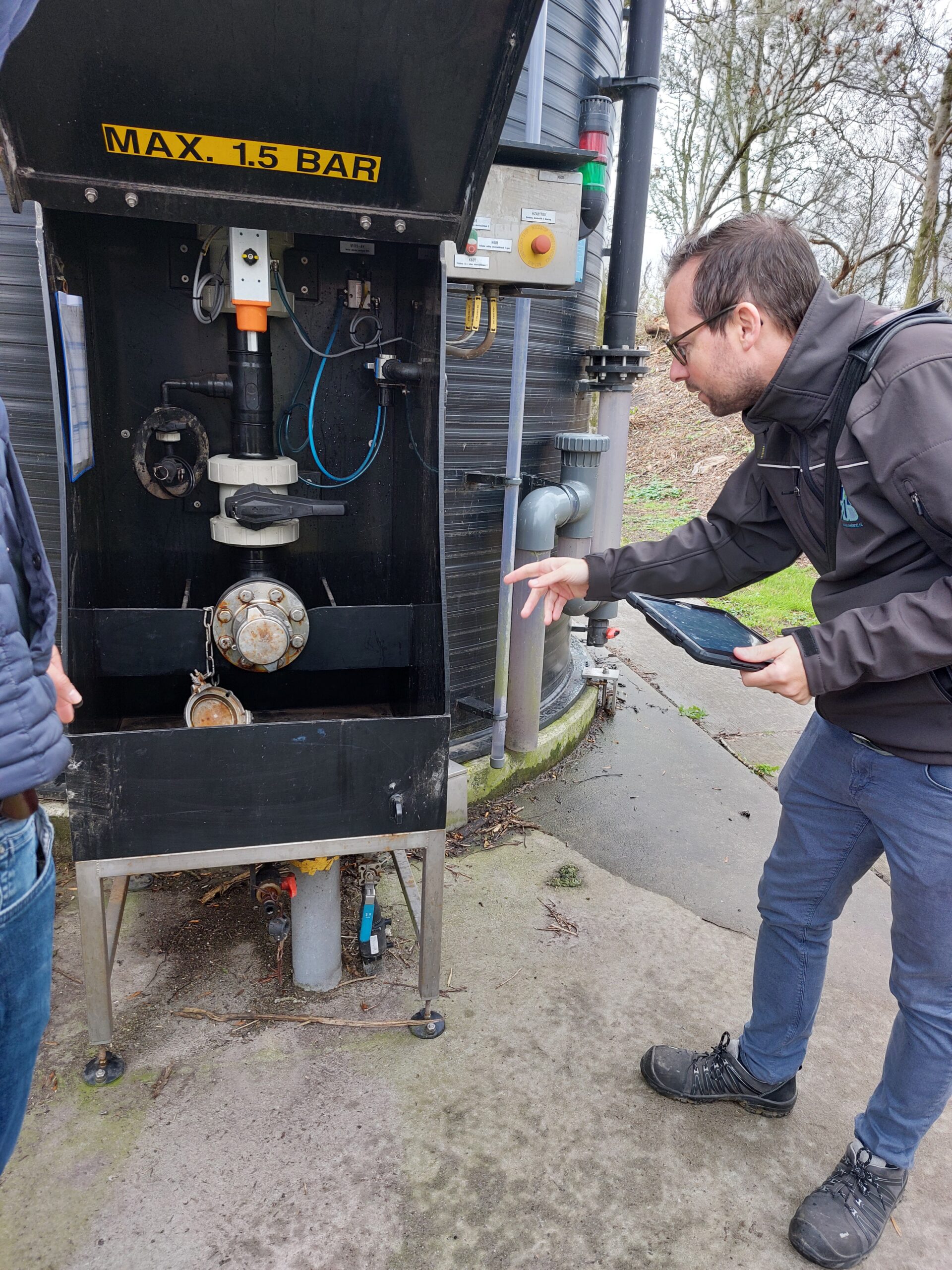 Dan gaan we het terrein van de rioolwaterzuiveringsinstallatie (rwzi) op. In een rwzi wordt afvalwater uit huishoudens en regenwater gezuiverd. Het water dat binnenkomt heet influent. De grote stukken zoals plastic worden er eerst uitgehaald. Met verschillende stappen wordt het water schoon gemaakt. Dat gebeurt in verschillende tanks en door het toevoegen van bacteriën. Wat overblijft heet effluent. Er wordt een heel proces doorlopen, wat betekent dat er verschillende opslagtanks, leidingen en stoffen te vinden zijn op het terrein. Martijn luistert, vraagt door en maakt foto’s. Hij gaat zijn lijstje af. Zo zijn de vloeistofdichte vloeren in orde, worden de bassins volgens de voorschriften gekeurd en is er een plattegrond waar op staat wat er waar is opgeslagen. Na twee uur rondt Martijn de controle af en stapt hij weer in de auto. Hij constateert dat de voorschriften goed worden nageleefd en gaat nog enkele zaken uitzoeken.